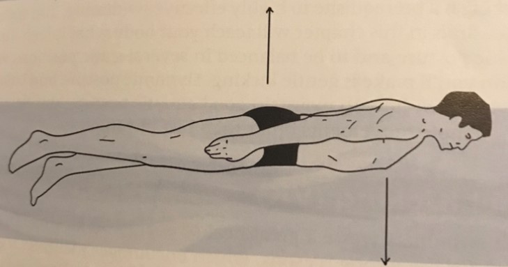 If you press one end of the kickboard toward the bottom, the other end rises. Similarly, if you are holding a tight line, then leaning on your buoy to press it toward the bottom raises your hips. The greater the force you lean on your buoy with, the greater the buoyant force of the water to hold your spinal tight line on the surface. As you press your chest buoy, you should feel your entire body tilting slightly downhill, fully supported by the water.